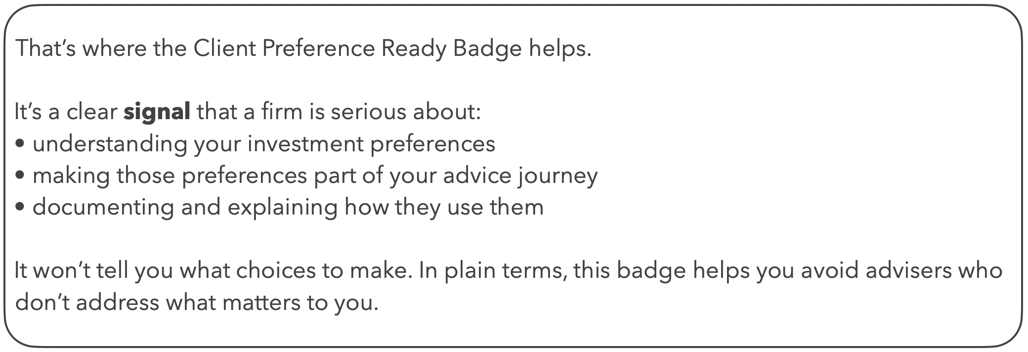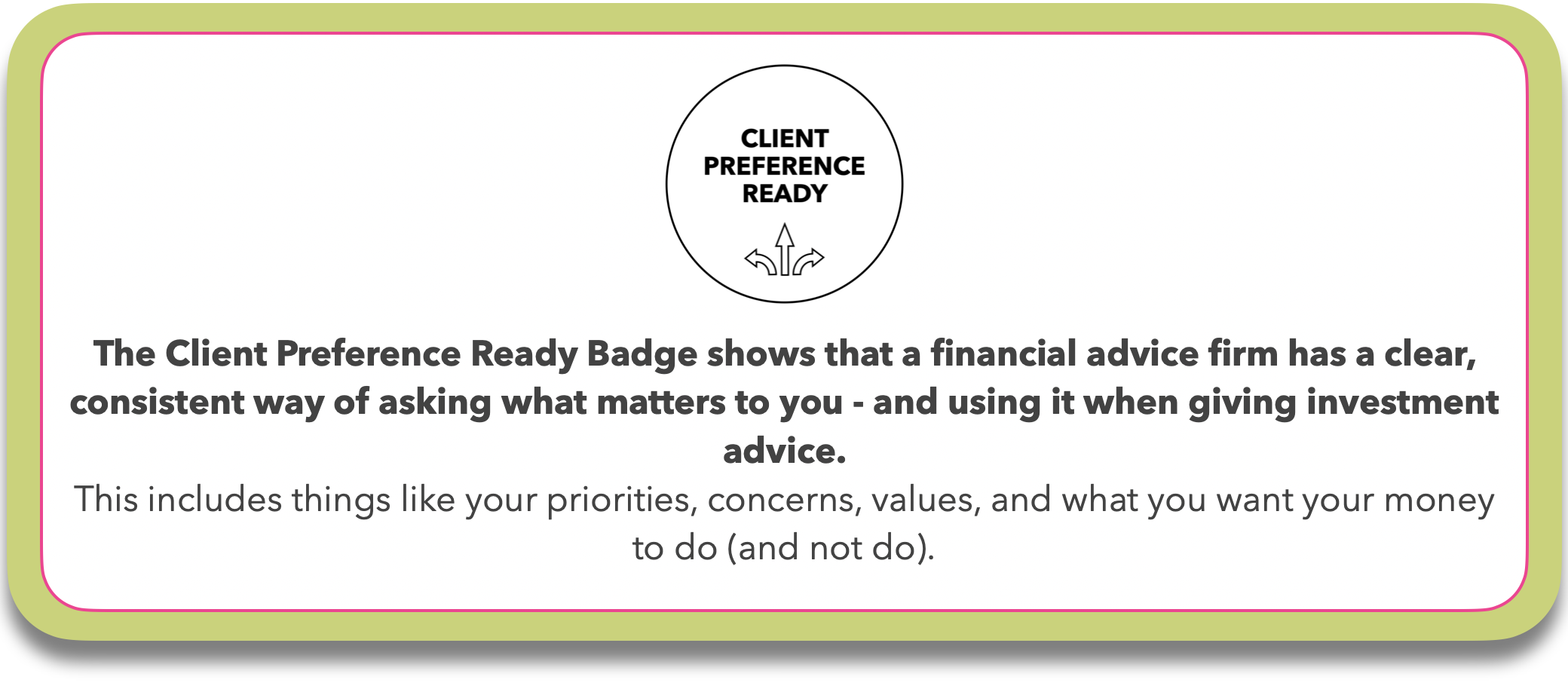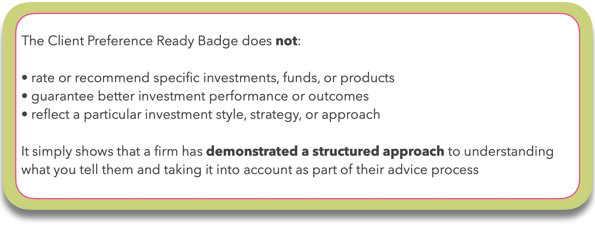 Any financial advice firm can apply for the badge. The Client Preference Ready Badge is an independent, voluntary standard run by In ACCORD.